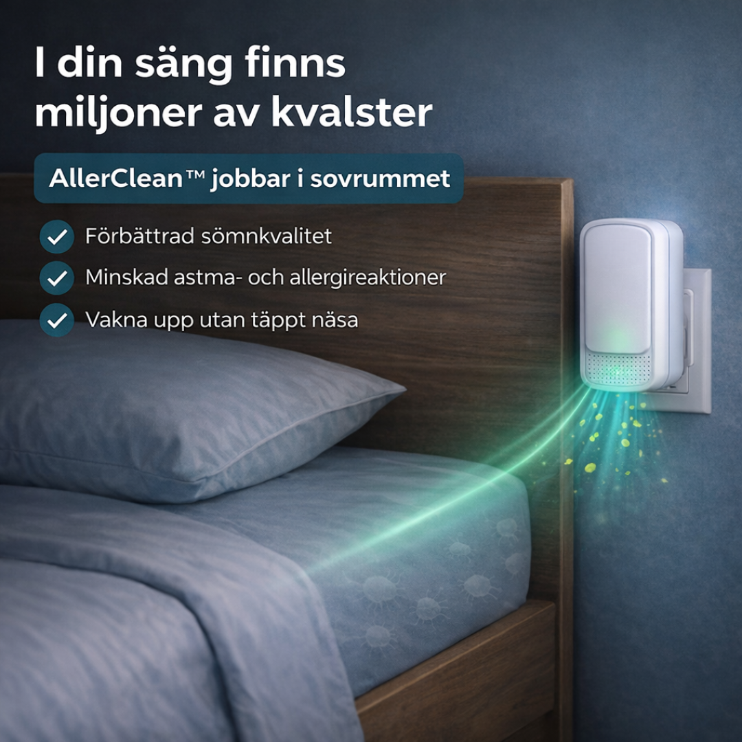 Upplev ett naturligt och helt kemikaliefritt sätt att bli kvalsterfri med AllerClean™. Plugga in den i vägguttaget – och AllerClean gör jobbet åt dig, helt tystlåten och underhållningsfri. Det genom att den binder luftburna mikropartiklar och kvalsterallergener, så de klustrar ihop och faller ur andningszonen. Redan efter några nätters upplever många kunder bättre sömn, mindre nästäppa och en friskare hemmiljö.