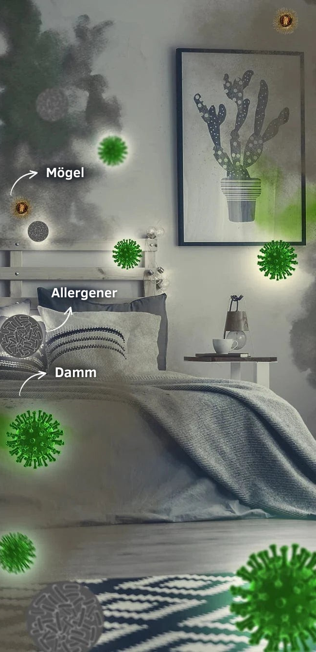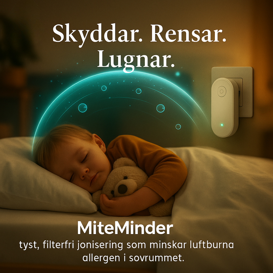 Med MiteMinder™ sprids negativa joner som binder allergen och mikropartiklar så de faller ur andningszonen – helt utan filter, spray eller kemikalier.